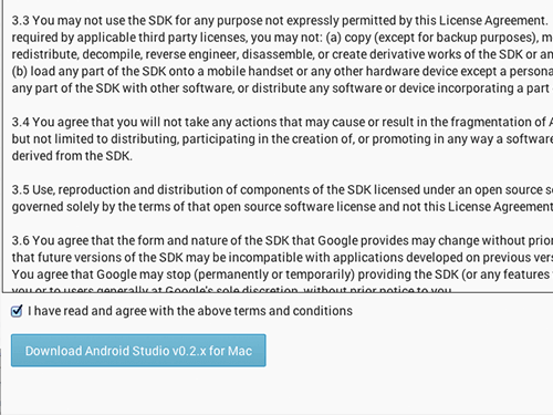 ต่อมาก็ทำการคลิกที่ปุ่ม I have read and agree with the above terms and conditions แล้วคลิกที่ปุ่ม Download Android Studio V0.2.x for Mac ดังรูป