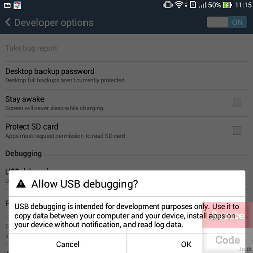ที่หน้านี้ให้ทำการ เลือก USB Debugging โดยให้เช็คเลือกนะครับ จะมีข้อความให้ยืนยันการเลือกของเรา ก็ให้คลิกที่ OK เพื่อยืนยัน