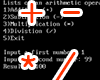 Lists of an arithmetic operator 1)Addition (+) 2)Subtraction (-) 3)Multiplication (*) 4)Divistion (/) Plaese select the arithmetic operator:1 Input a first number:5 Input a first nunber:18 the result is 23.